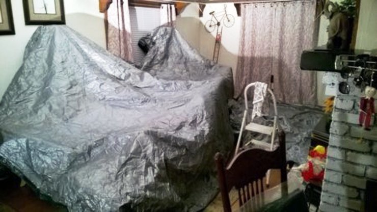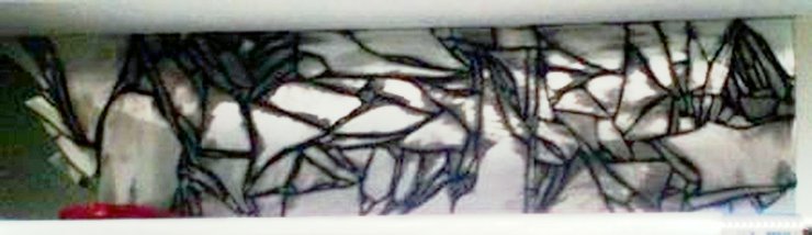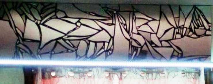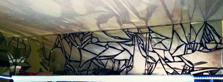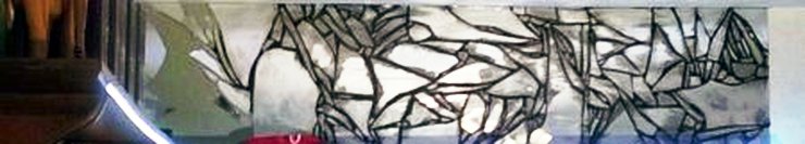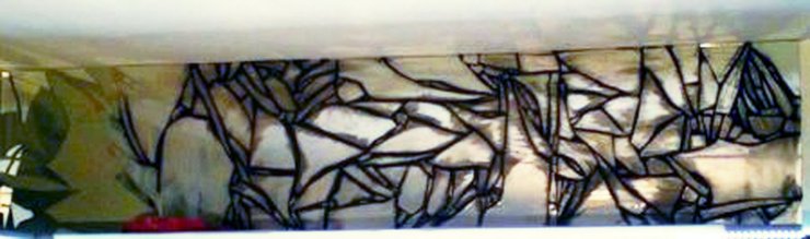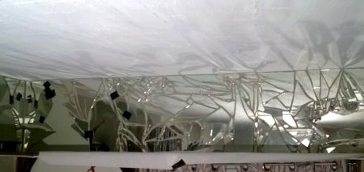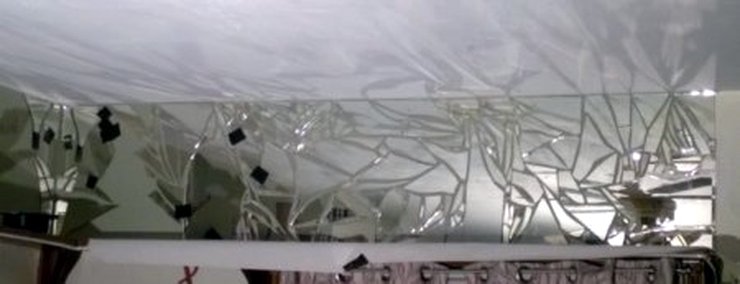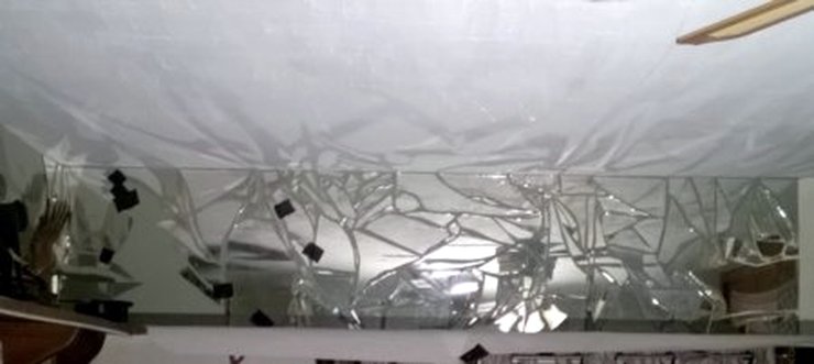 The images on this page show a broken mirror being installed with charcoal-colored mortar.